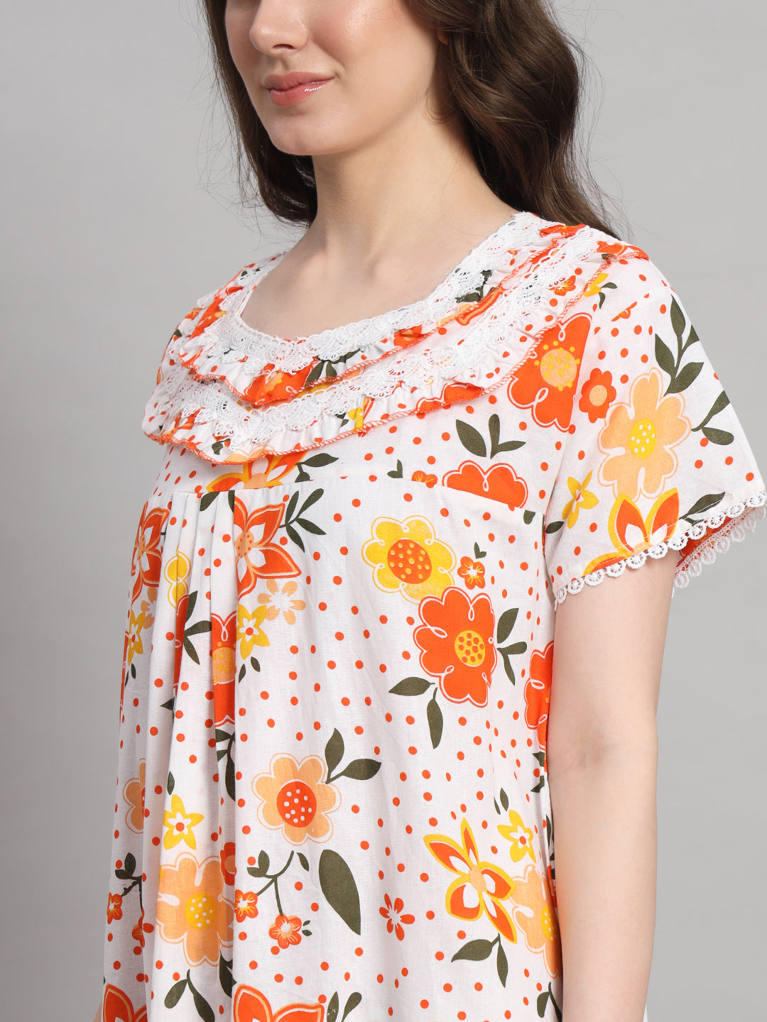 🌼 White & Orange Floral Printed Cotton Night Gown with Lace Neck – Comfortable Maxi Nightwear for Women