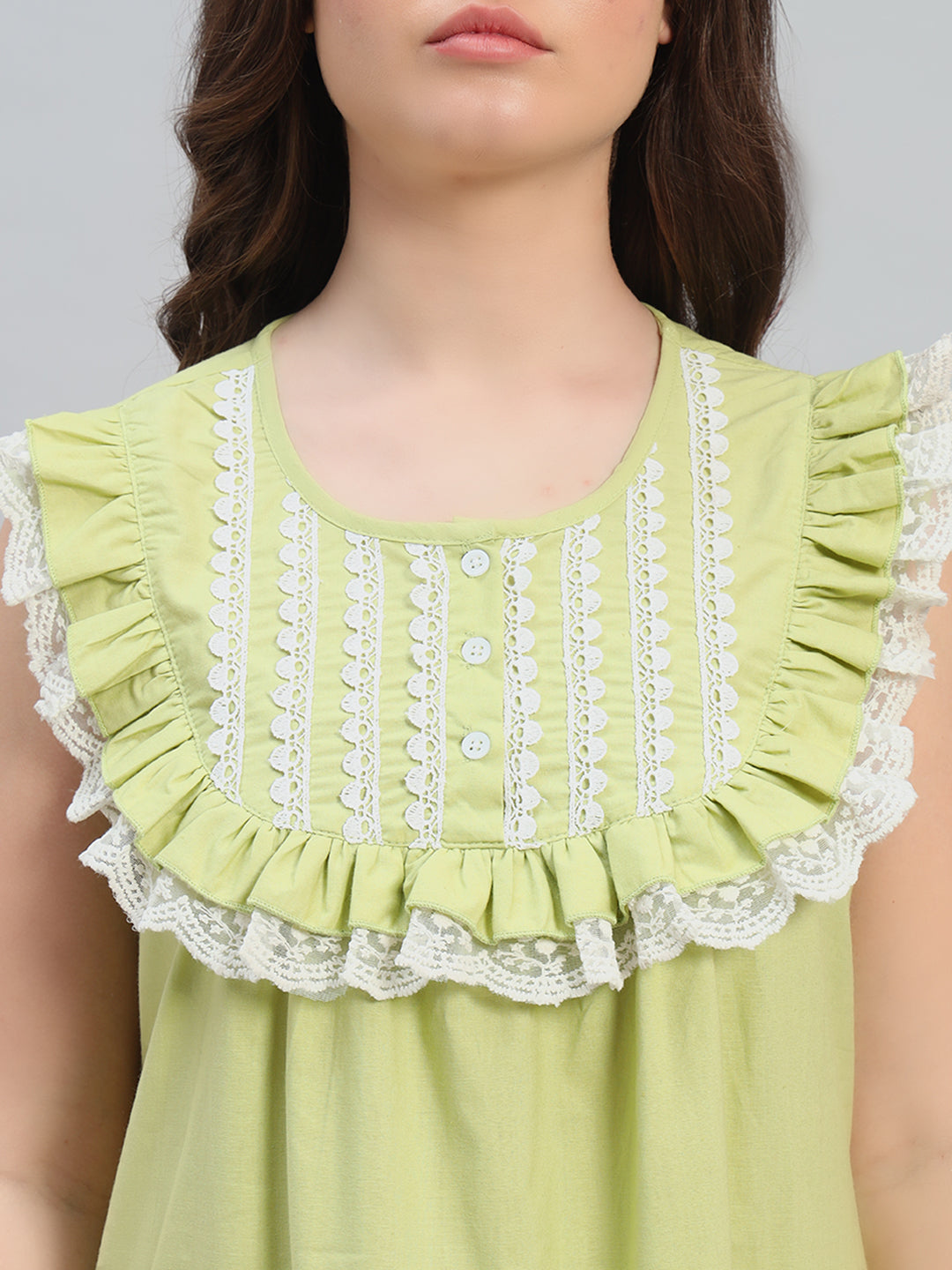 ๐ Lime Green Cotton Maxi Night Gown for Women โ Sleeveless Lace Yoke Comfortable Nightwear