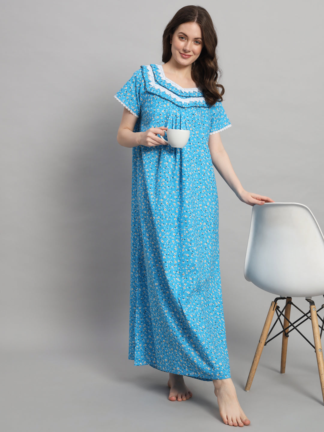 ๐ Sky Blue Floral Printed Cotton Night Gown with Lace Neck โ Comfortable Maxi Nightwear for Women