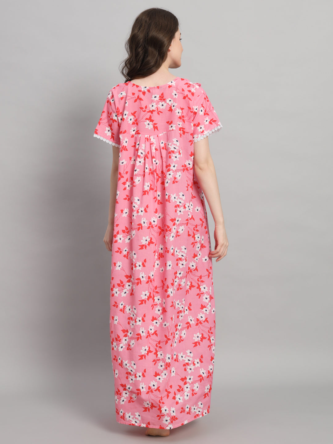 ๐ธ Pink Floral Printed Cotton Night Gown with Lace Neck โ Comfortable Maxi Nightwear for Women